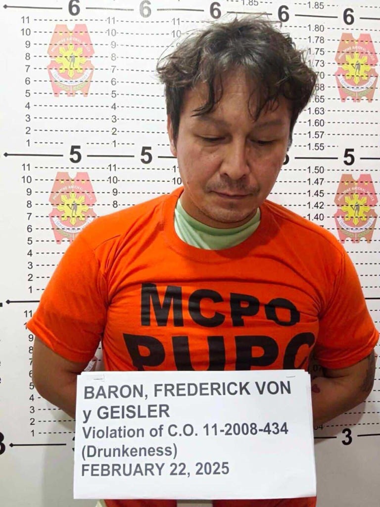 Actor Baron Geisler was detained in Mandaue City on Saturday for allegedly violating City Ordinance 11-2008-434, which penalizes public drunkenness. Geisler was released after posting a ₱500 bail, according to Police Col. Mercy Villaro, Public Information Officer of the Mandaue City Police Office.