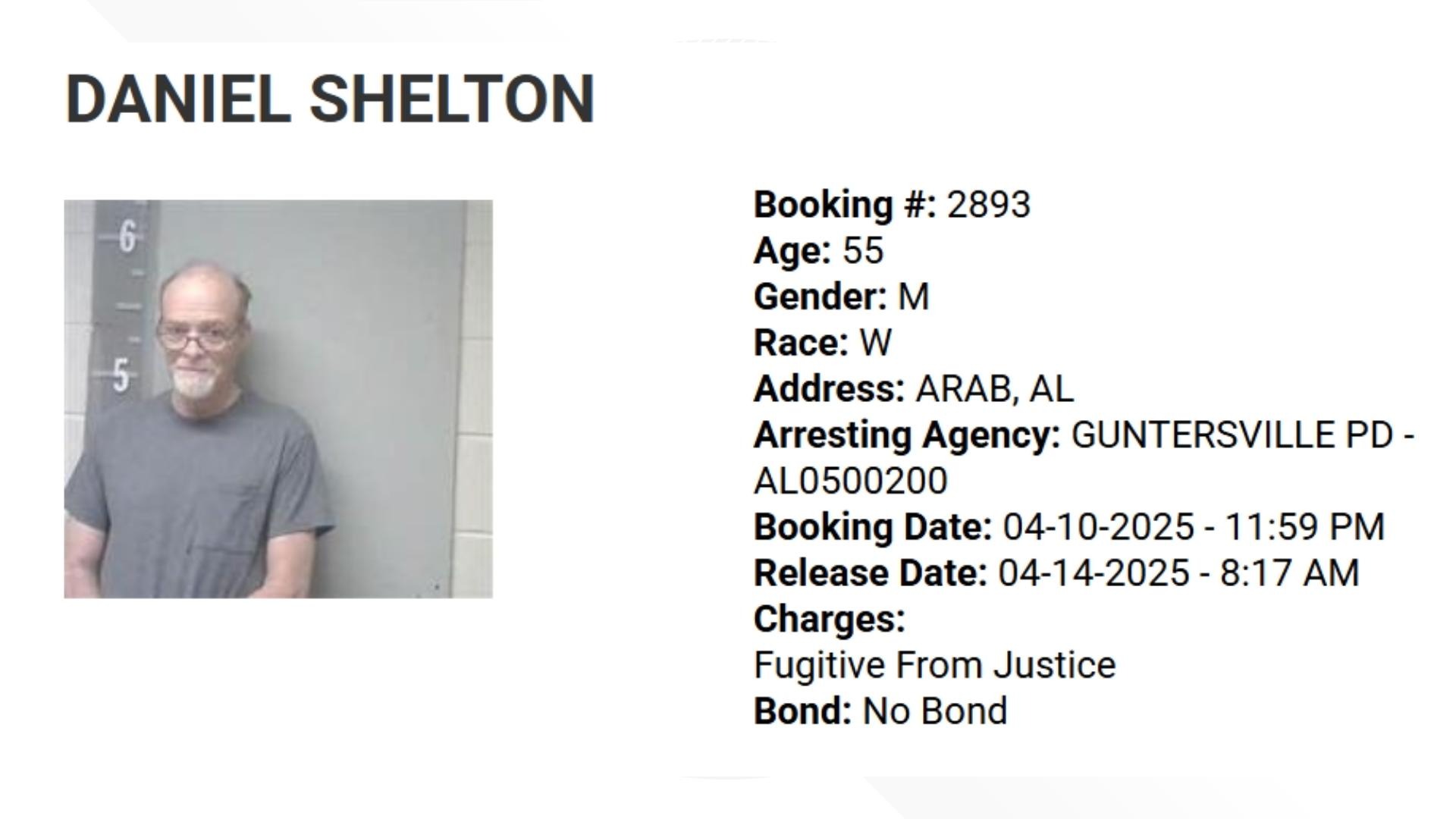 A background check revealed Shelton was previously arrested on April 10 in Guntersville on a fugitive warrant out of Tennessee for domestic assault but was released on his own recognizance.