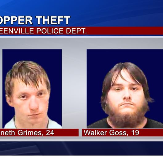 Kenneth Grimes, 24, and Walker Goss, 19, face felony charges for malicious mischief and possession of burglary tools, according to the Greenville Police Department.