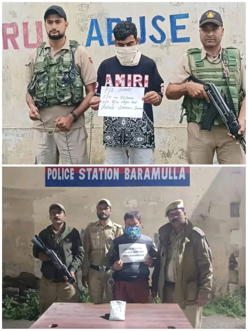 in a continued crackdown on drug trafficking, police in Baramulla and Srinagar arrested four individuals and seized significant quantities of heroin and charas in separate operations.